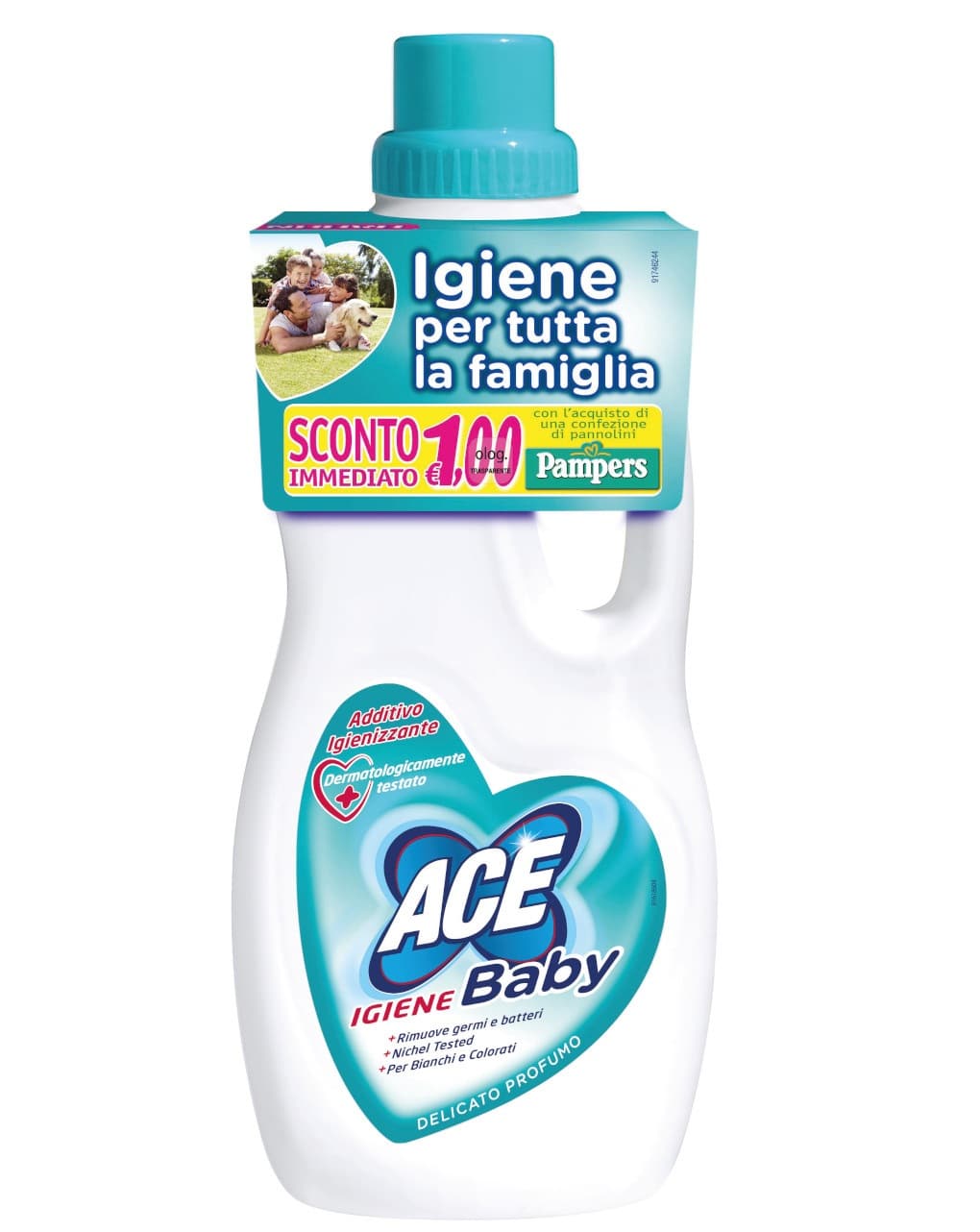 ACE Igiene Baby è un additivo igienizzante senza candeggina dal delicato e fresco profumo. La sua formula dermatologicamente testata anche su pelli sensibili e nichel, rispetta anche le pelli più delicate come quelle dei bambini. ACE Igiene Baby, studiato per contribuire al benessere di tutta la famiglia, igienizza e pulisce in profondità il bucato bianco e colorato, rimuovendo germi e batteri.