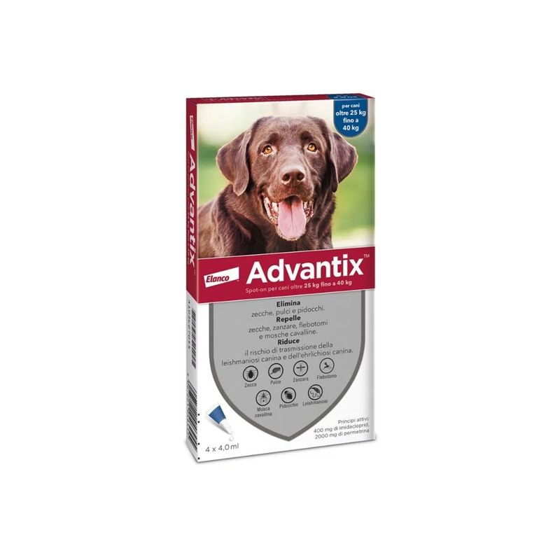Advantix è un antiparassitario in pipette spot-on, specificamente formulato per proteggere i cani di taglia grande (da 25 a 40 Kg) da una vasta gamma di parassiti esterni. Grazie alla sua duplice azione, offre una protezione a largo spettro contro pulci, zecche, zanzare, flebotomi e mosche cavalline, aiutando a prevenire le malattie e a mantenere il benessere del tuo cane. Questo antiparassitario agisce rapidamente eliminando i parassiti e offre una protezione a lunga durata.