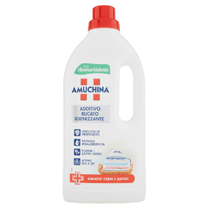 Amuchina Additivo Liquido Igienizzante con Ammorbidente igienizza in modo sicuro il bucato di tutta la famiglia, agendo già alle basse temperature. La forma liquida del prodotto ne permette l’uso sia a mano che in lavatrice nell’ultimo risciacquo.