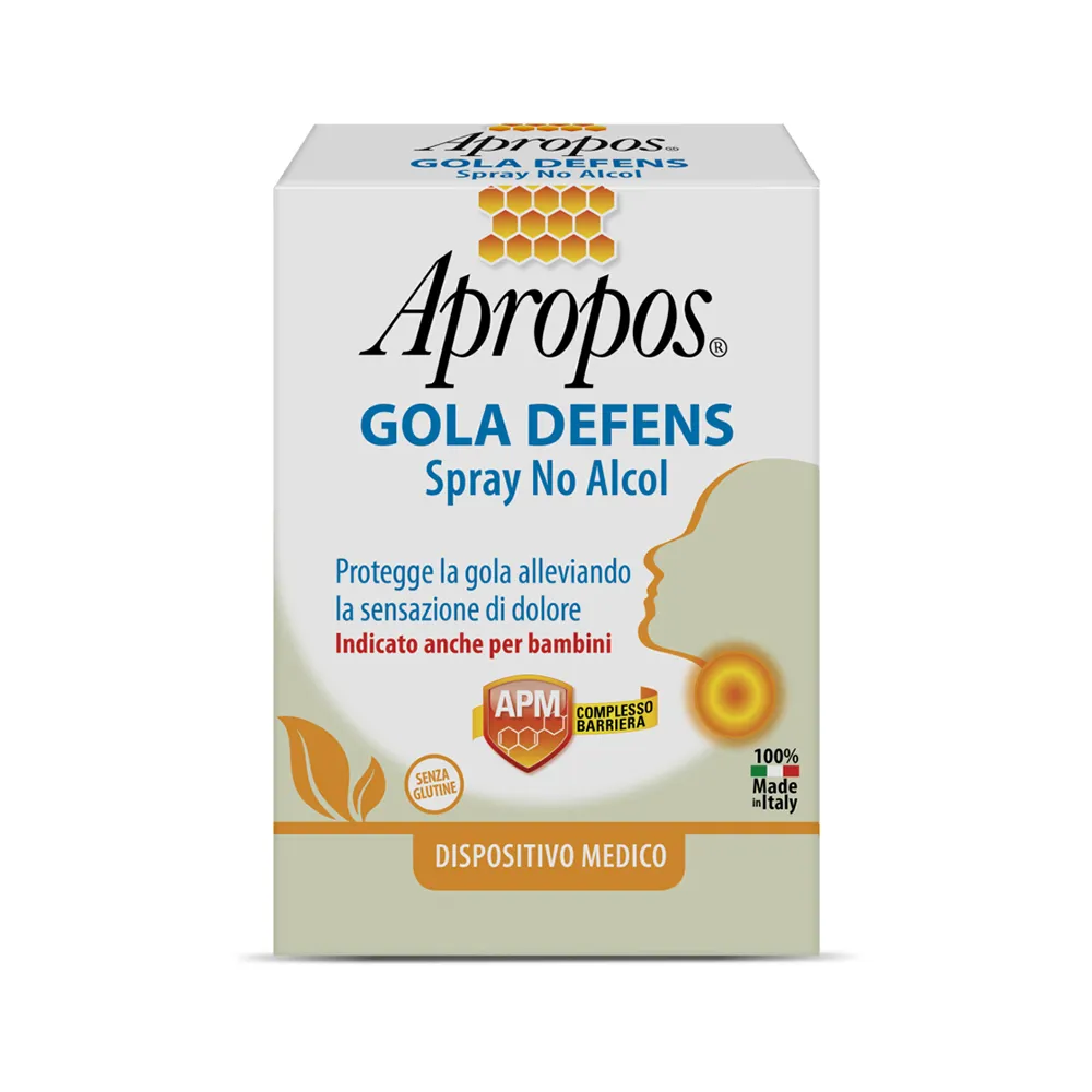 Apropos GOLA DEFENS Spray No Alcol, grazie al Complesso Barriera APM crea un film mucoadesivo ad effetto barriera che protegge la mucosa orofaringea dall’attacco di agenti esterni dannosi, idratandola. Grazie all’azione filmogena Apropos GOLA DEFENS Spray No Alcol mantiene la gola protetta dagli agenti esterni, alleviando la sensazione di dolore legata agli stati irritativi della gola, tipici delle faringiti e delle tonsilliti. Il prodotto è senza alcol, quindi indicato anche per l’utilizzo da parte di bambini.
