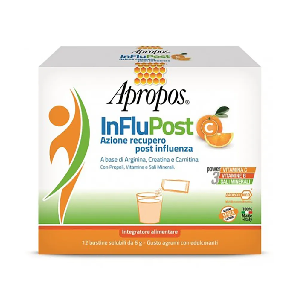 Apropos InFluPost C Azione recupero post influenza è un integratore alimentare a base di Arginina, Creatina e Carnitina con estratti di Propoli*, Vitamina C, Vitamine del Gruppo B e Sali Minerali per il recupero dai sintomi di affaticamento e carenza di energia, in seguito a periodi influenzali e raffreddore.