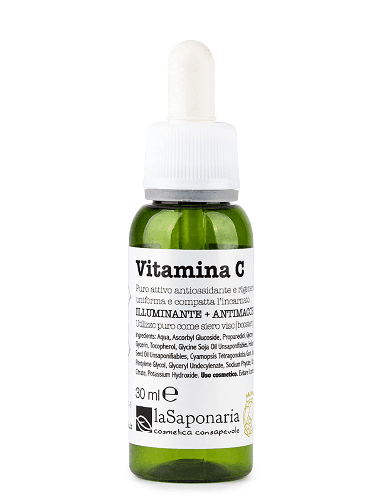 acido ascorbico, meglio noto come Vitamina C, è un vero e proprio concentrato di benessere dalle molteplici proprietà ! Si tratta però di una molecola molto instabile, per questo motivo nel nostro attivo puro è stata stabilizzata con l’aiuto della Vitamina E: così abbiamo un attivo stabile con efficacia duratura e allo stesso tempo beneficiamo della loro azione sinergica e di un effetto potenziato. Quali sono le sue proprietà ? La Vitamina C è un potentissimo antiossidante in grado di neutralizzare l’azione dei radicali liberi e di contrastare i segni dell’invecchiamento stimolando la produzione di collagene. Dona estrema luminosità alla pelle rendendola fresca e radiosa: niente più viso spento e stanco, neanche durante i cambi di stagione! Questo attivo portentoso ha anche un effetto uniformante: schiarisce le macchie e compatta la texture. Per tutti questi motivi è spesso utilizzata nella regina delle beauty routine La skincare coreana€ e non potrà mancare nemmeno nella tua. Flacone re-bottle realizzato con plastica riciclata post-consumo dotato di schermo anti UV, in modo che l’efficacia del prodotto contenuto all’interno sia sempre massima. Aqua, Ascorbyl Glucoside, Propanediol, Glyceryl Caprylate, Glycerin, Tocopherol, Cyamopsis Tetragonoloba Gum, Pentylene Glycol, Glyceryl Undecyle nate, Glycine Soja Oil Unsaponifiables, Helianthus Annuus Seed Oil Unsaponifiables, Sodium Phytate, Xanthan Gum, Citric Acid, Sodium Citrate, Potassium Hydroxide