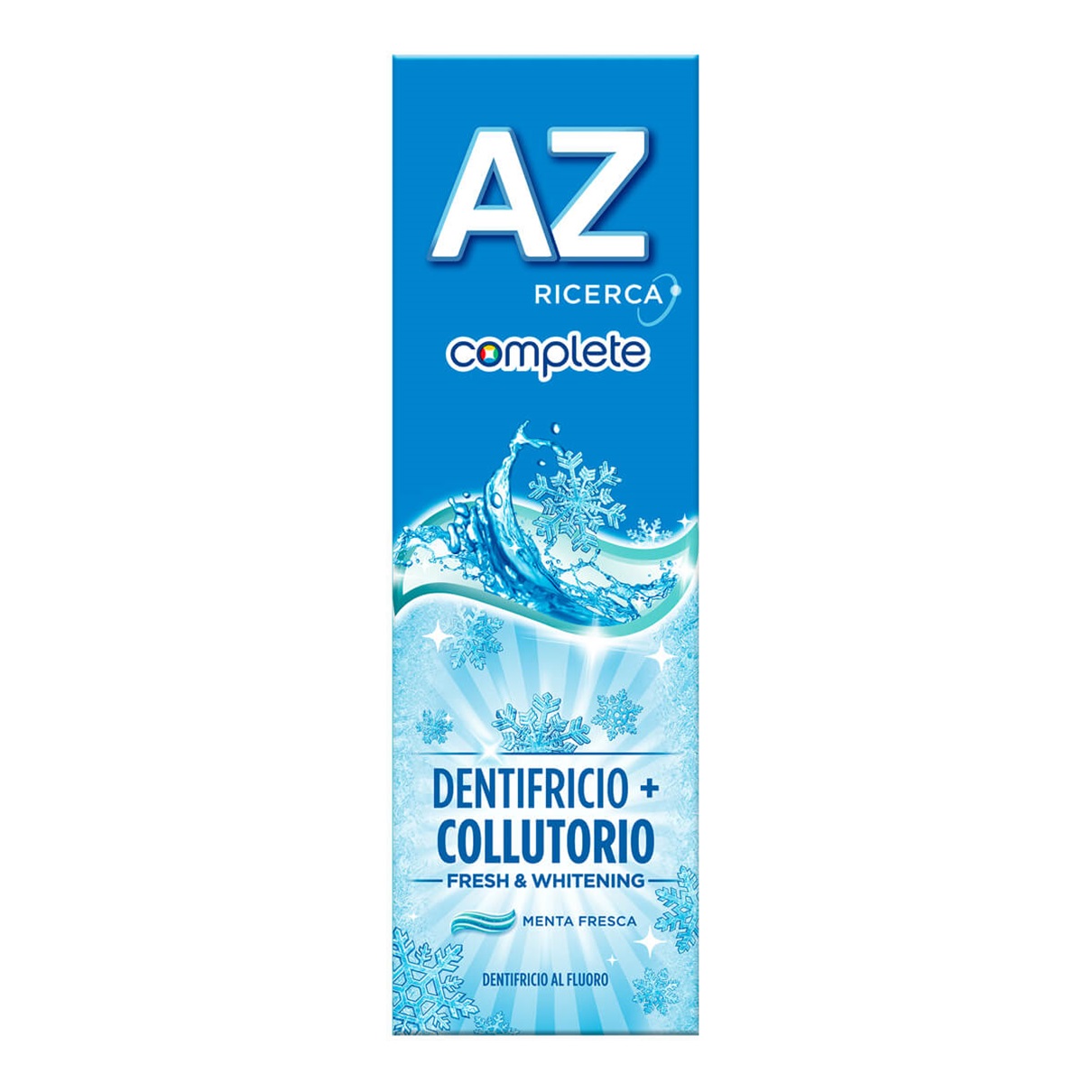 l dentifricio AZ Complete Fresh & Whitening con collutorio pulisce anche le zone difficili da raggiungere. Contiene due tipi di particelle sbiancanti che rimuovono delicatamente le macchie e aiutano a mantenere il bianco naturale dei denti, rinfrescando l’alito grazie al piacevole sapore di menta fresca.