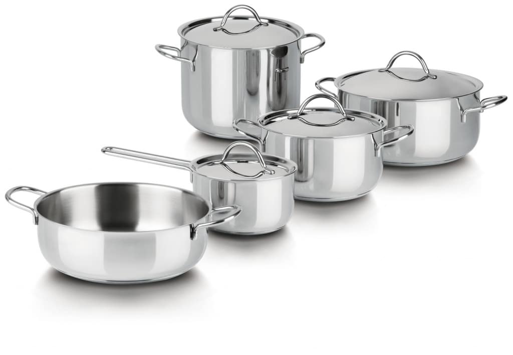18/10, con rivestimento interno satinato e esterno lucidato per una facile pulizia. Il triplo fondo, acciaio – alluminio – acciaio, favorisce una distribuzione omogenea del calore per una cottura perfetta senza grassi e a vapore.