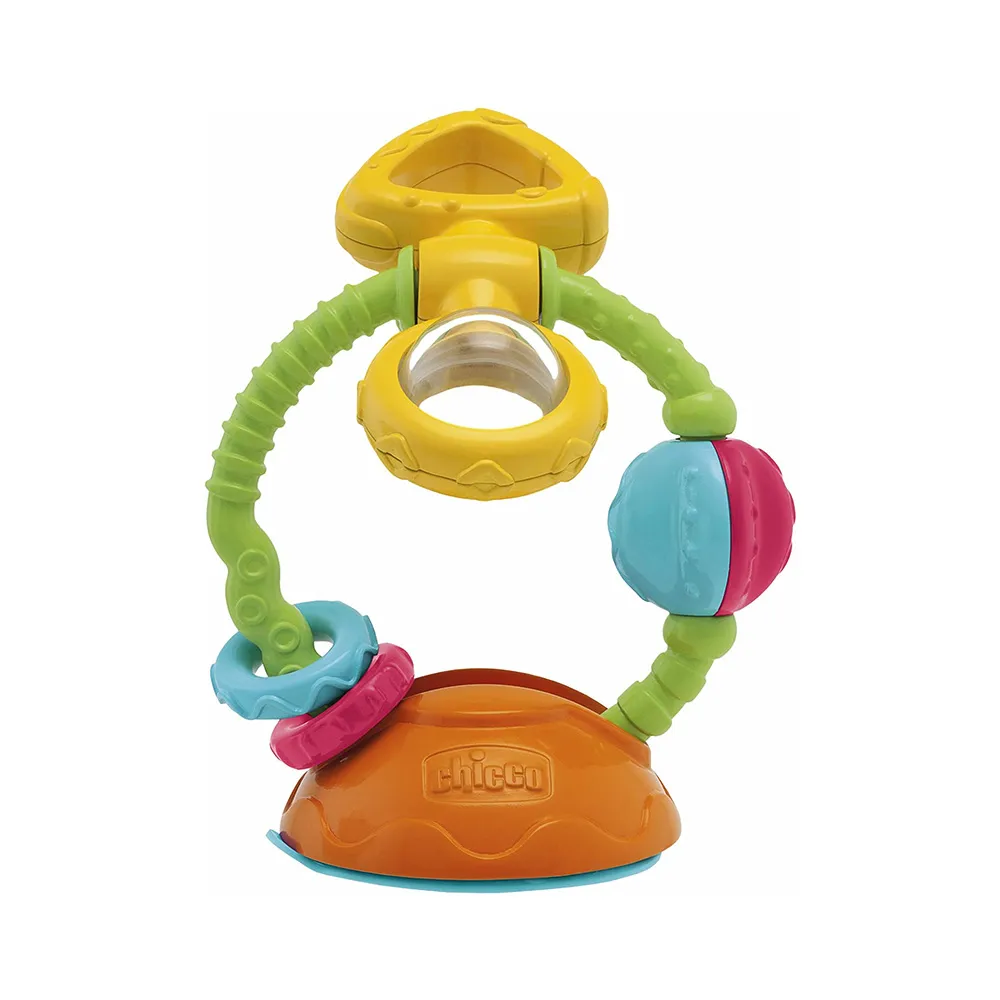 La parte centrale del gioco ruota a 360°: le palline colorate nella sfera muovendosi creano un simpatico tintinnio. La superficie plastica presenta delle textures differenti per sviluppare la sensibilità tattile del tuo bambino.