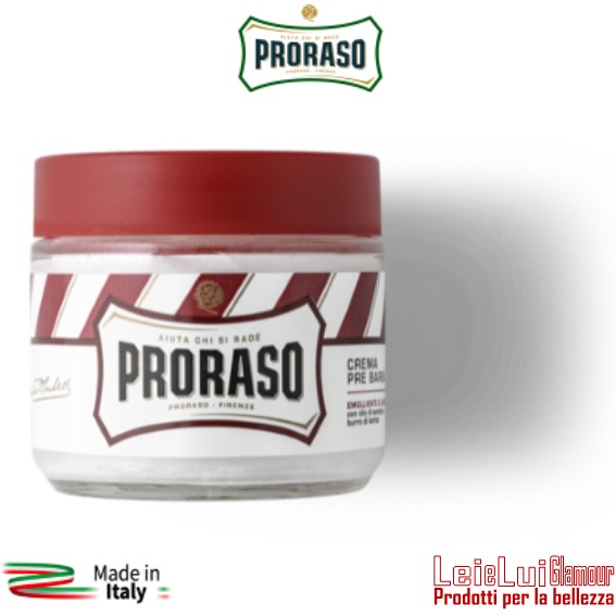 [icon icon=icon-ok size=16px color=#800000 ] Formula: la formula, arricchita con Olio di Sandalo e Burro di karité, assicura alla pelle un nutrimento profondo, mantenendola morbida ed elastica. La barba risulta più morbida e la rasatura facilitata. [icon icon=icon-ok size=16px color=#800000 ] Modo d’uso: inumidisci il viso e applica Proraso Crema Pre Barba; massaggia con movimenti circolari e non risciacquare. Quindi procedi normalmente alla rasatura col sapone o con la schiuma da barba.[icon icon=icon-ok size=16px color=#800000 ] Indicato: per barbe dure, folte e difficili.
