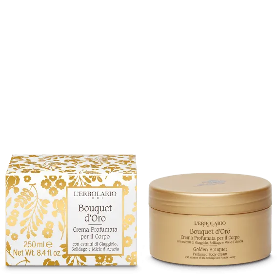 Simbolo di luce, gioia e ricchezza, lo scintillante color oro “è colato” nella ricetta di questa Crema per il Corpo preziosissima per la pelle: il Miele d’Acacia, idratante e perfetto per donare morbidezza, si unisce a estratti di fiori dalle sfumature dorate, come l’antiossidante Solidago e l’idratante Giaggiolo giallo, da cui abbiamo ricavato non solo un estratto dalle virtù tonificanti, ma anche un’acqua distillata addolcente e fragrante. Fondamentale è, infine, l’azione elasticizzante di burro e olio di Mandorle, che si affianca agli emollienti oli di Cocco e Ricino. Per una pelle davvero più morbida, idratata e avvolta da un incantevole e “sfavillante” profumo.