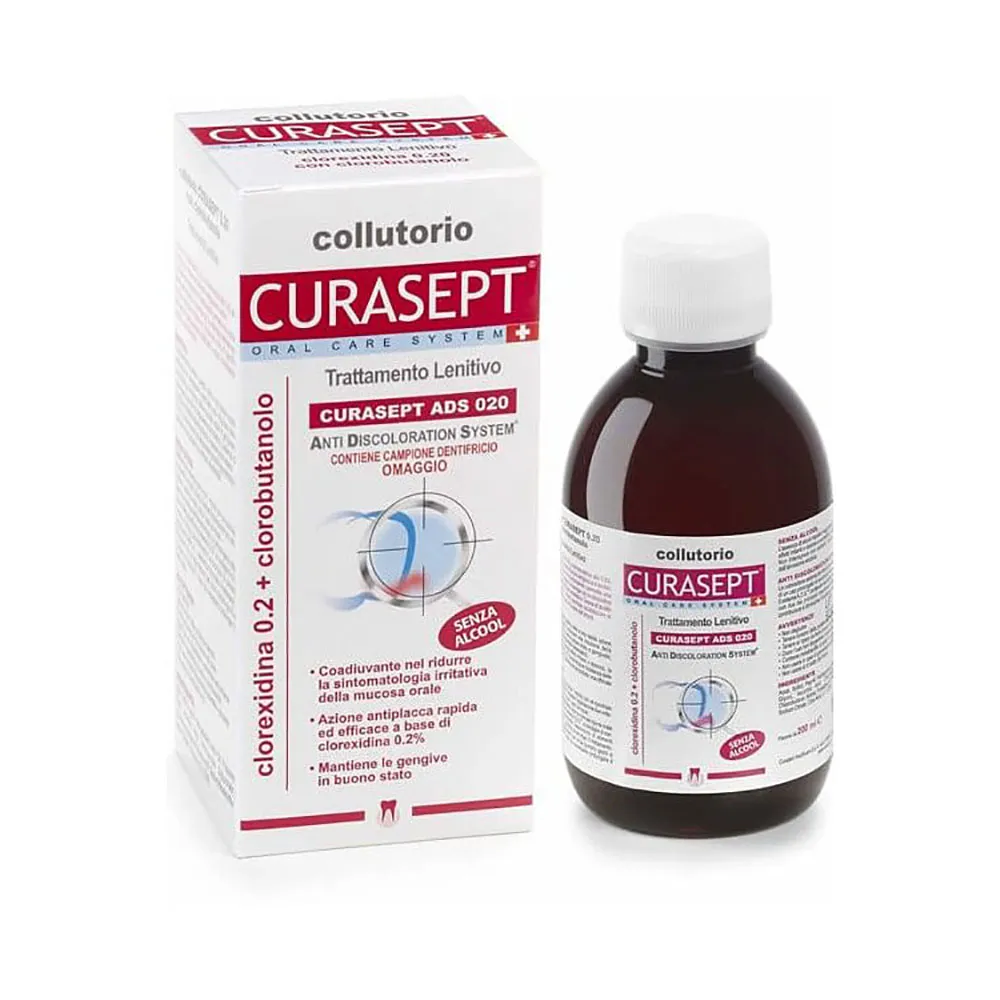 Collutorio che contiene clorexidina allo 0,2%, un disinfettante che contrasta lo sviluppo dei batteri impedendone lo sviluppo, e clorobutanolo allo 0,5% che svolge un’azione lenitiva per il cavo orale.