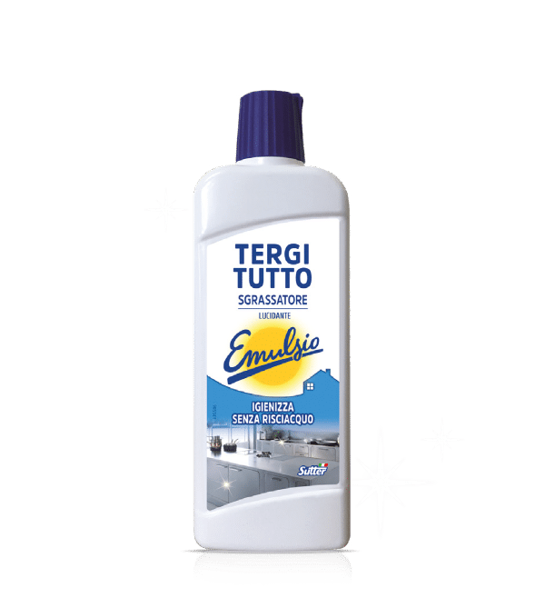 Emulsio Tergitutto è lo sgrassatore universale senza risciacquo che grazie alla sua formula in crema non abrasiva, pulisce igienizza e sgrassa a fondo tutte le superfici lasciandole brillanti. Rapido ed efficace, Emulsio TergiTutto è ideale per ripiani di lavoro, piani di cottura, fornelli, cappe, superfici in acciaio e laccate, piastrelle, vetri, mobili lavabili, infissi e tapparelle.