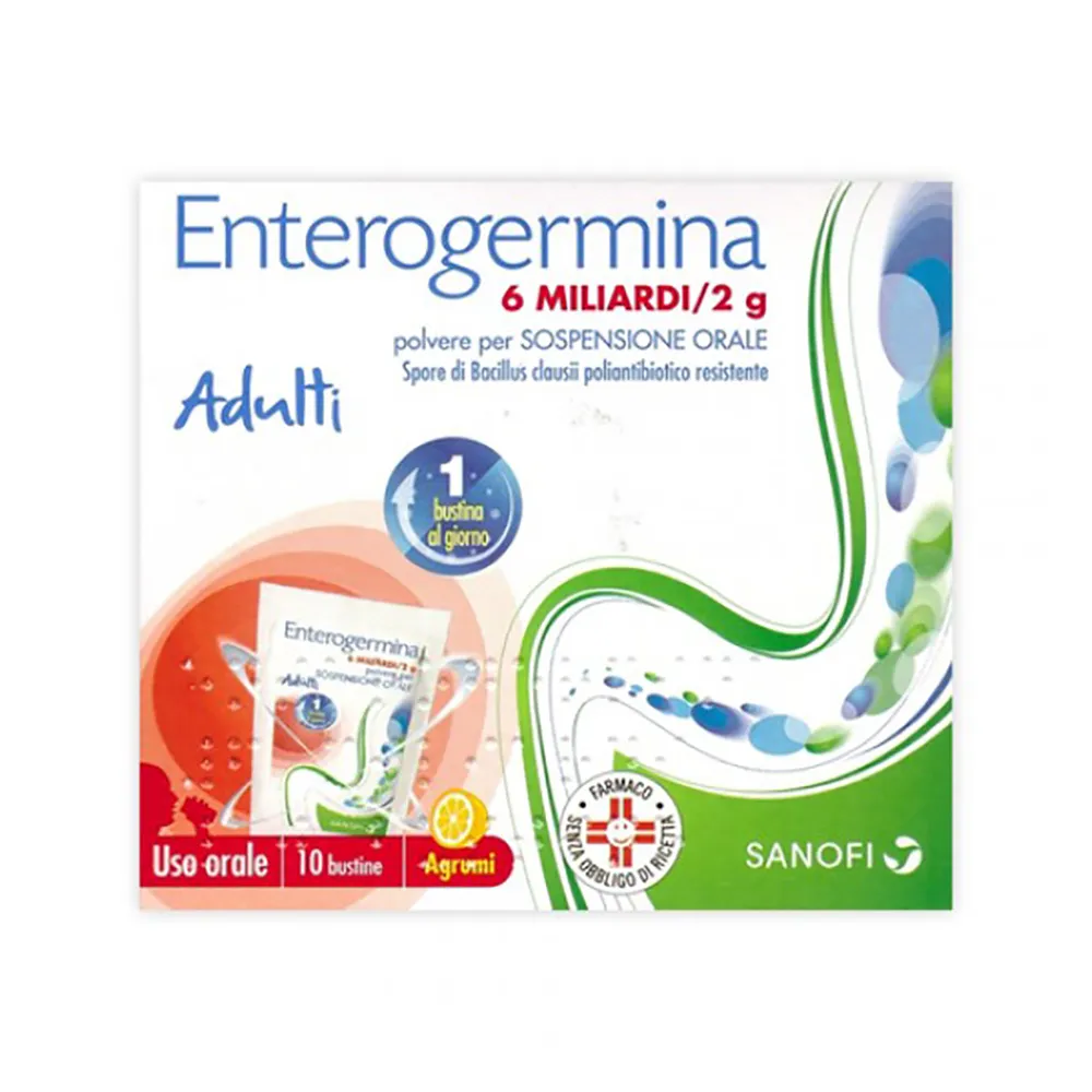 ENTEROGERMINA® 6 miliardi 10 Bustine 2 g. è un preparato formulato a base di spore di Bacillus clausii, abitualmente presente nell’intestino e privo di potere patogeno, indicato nella prevenzione e nel trattamento delle disbiosi intestinali.