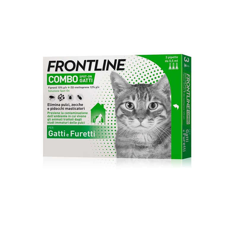 Frontline Combo Gatti è disponibile in confezione da 3 pipette spot-on da 0,5 ml. Conservare a temperatura inferiore ai 25°C e al riparo dall’umidità.