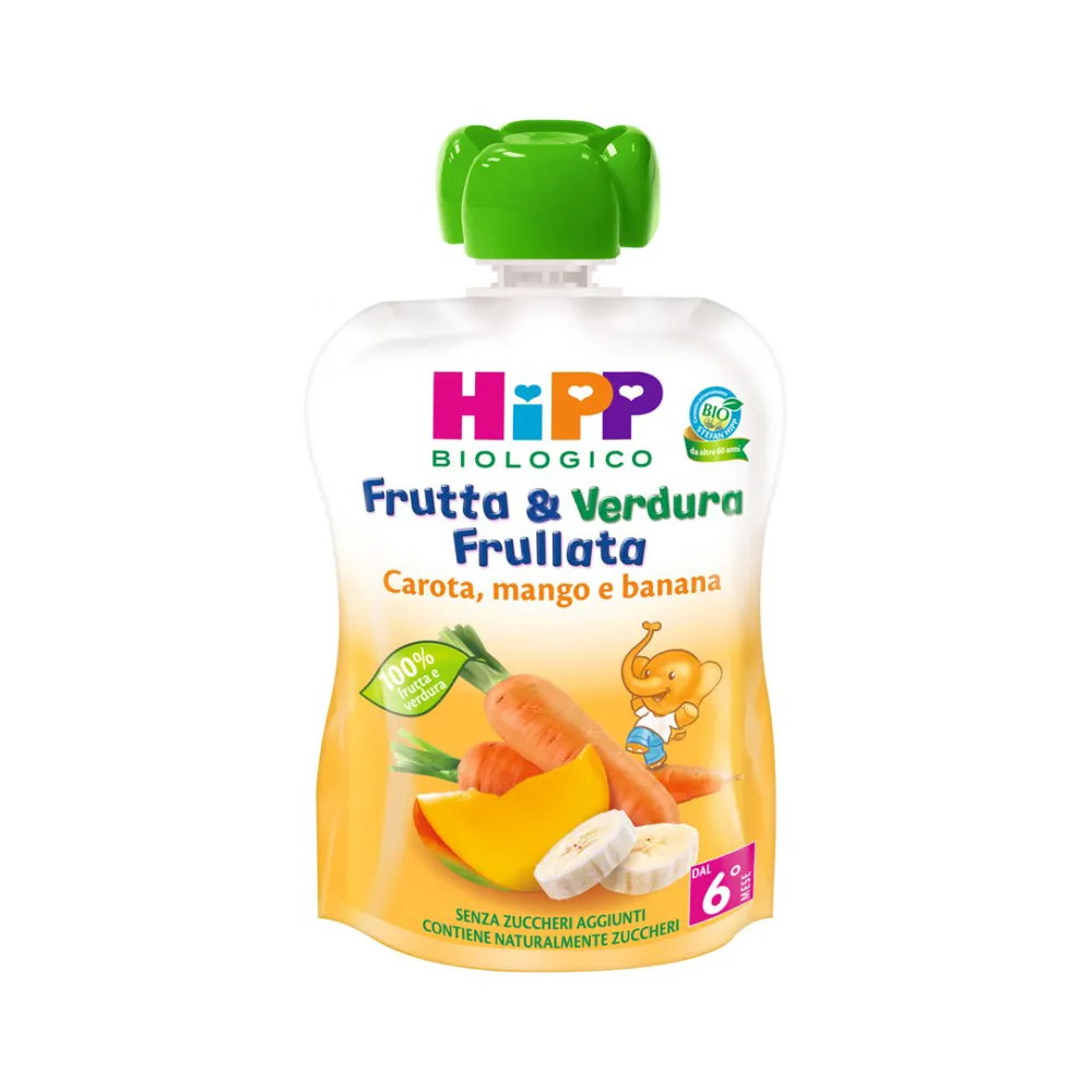 Hipp Frutta & Verdura Frullata Carota Mango e Banana è un alimento per la prima infanzia adatto dal 6° mese. Ideale come merenda.