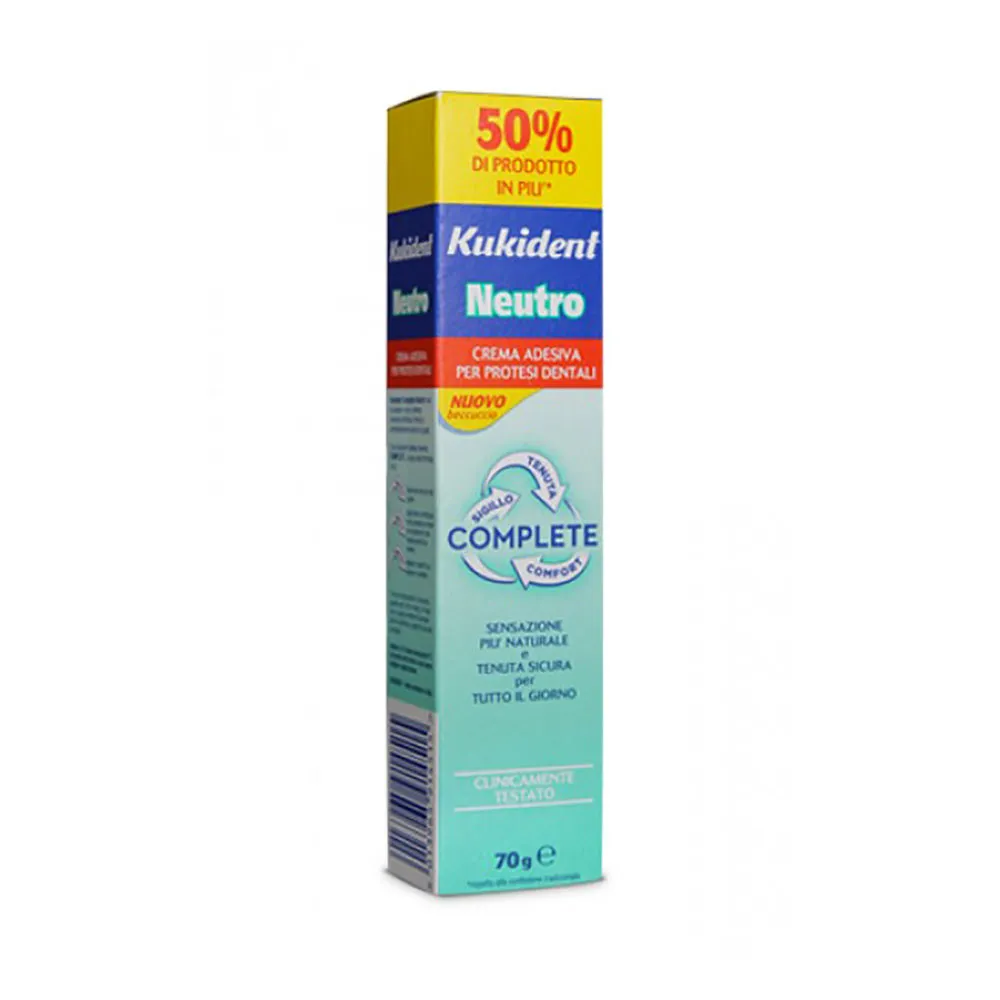 Crema adesiva per protesi dentali. Fornisce una presa forte e grande comfort senza colori artificiali o additivi per il sapore. Ha quindi un gusto completamente neutro.