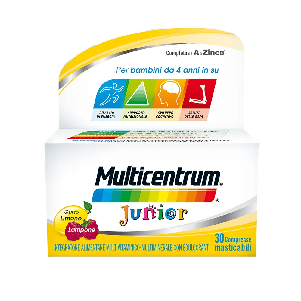 Multicentrum Junior è un integratore alimentare multivitaminico – multiminerale specificatamente formulato in compresse masticabili per bambini dai 4 anni in su.