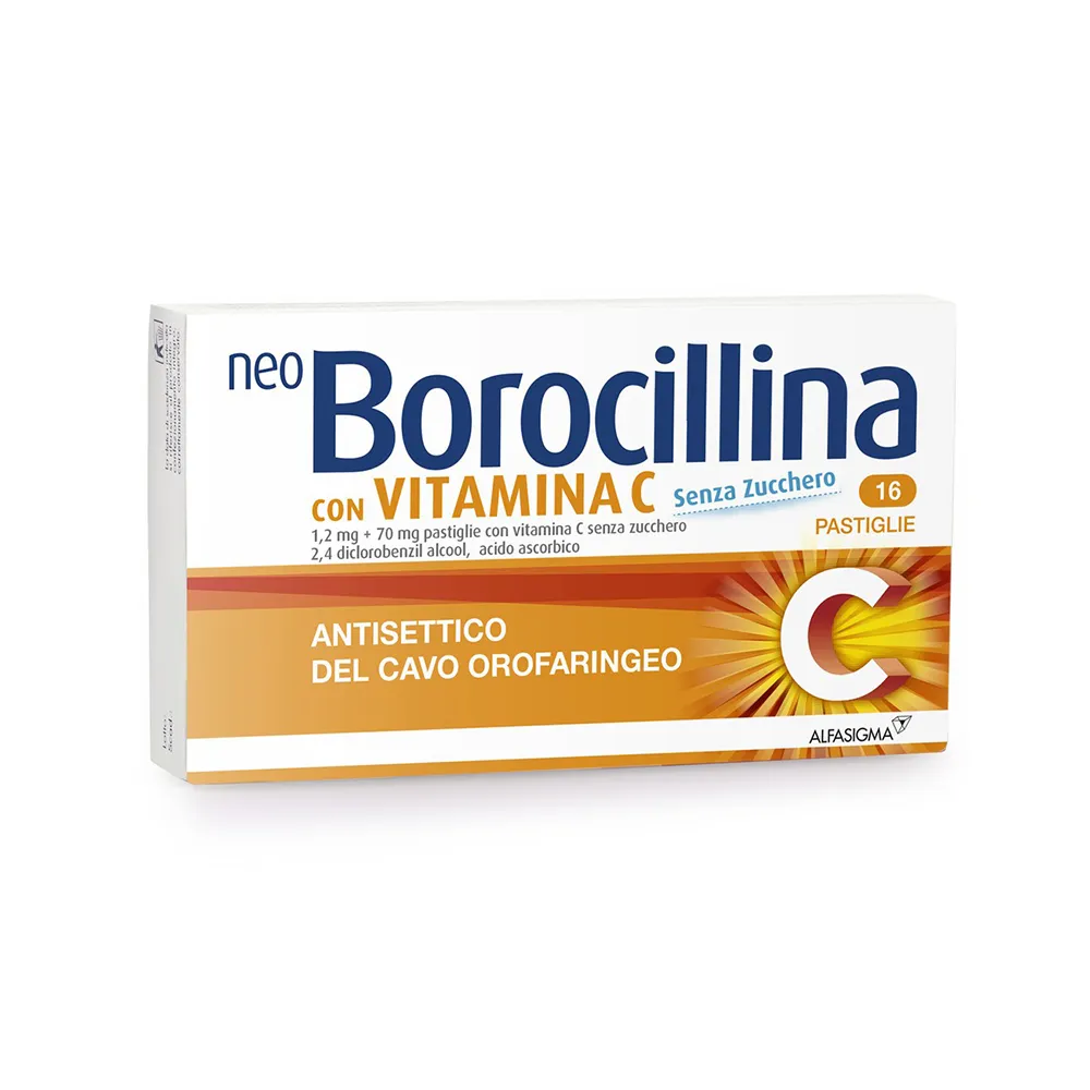 “NEOBOROCILLINA C” è da usare come antisettico e disinfettante del cavo orofaringeo. Pastiglie senza zucchero.