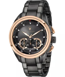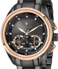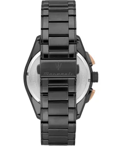 OROLOGIO UOMO FIRMATO MASERATI, DESIGN ITALIANO, MOVIMENTO CRONOGRAFO AL QUARZO, CASSA E CINTURINO IN ACCIAIO NERO INOSSIDABILE – COLLEZIONE TRAGUARDO- WR 100 mt – CORONA A VITE