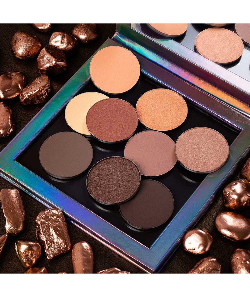 La gamma tonale di questa palette spazia dai rosa al color crema, dai nocciola delicati ai marroni più intensi, sia satinati che opachi, con un tocco di vivacità data da un color ocra con riflessi rosa duochrome.