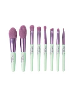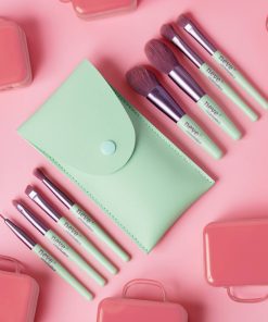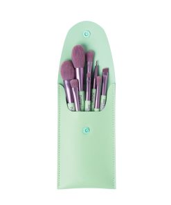 Pastel Pop Vegan Brush Set contiene una pochette in vegan leather verde menta, pratico e resistente e otto pennelli morbidissimi per truccare viso, occhi e labbra senza rinunciare a niente: