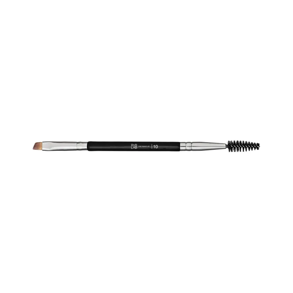 RVB Lab by Diego Dalla Palma Pennello professionale duo con lato scovolo mascara e lato pennello obliquo, ideale per lavorare e definire le sopracciglia. Lo scovolo mascara dalla forma conica, realizzato con setole sintetiche a spirale medio morbide, permette di pettinare e districare le sopracciglia. La combinazione di setole flessibili e la forma angolata garantiscono massima precisione e consentono l’utilizzo sia di prodotti in crema, sia in polvere.