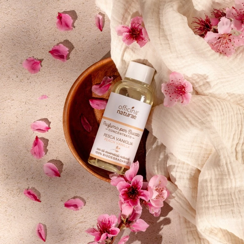 Immergiti in un mondo di freschezza e Natura con il nostro Profumo per Bucato Pesca Vaniglia della linea di prodotti per bucato e casa di Officina Naturae. È una sinfonia di profumi naturali che abbraccia il tuo bucato: creato con frazioni di oli essenziali naturali, questo profumatore per bucato trasforma il momento in cui indossi i tuoi capi, o stendi la tua biancheria, in un’esperienza deliziosamente profumata. La sua composizione vivace, che mixa note verdi di Aloe al profumo fruttato della polpa di Pesca e del latte di Cocco, si sposa con una delicata nota centrale floreale e una nota morbida di fondo muschiata.