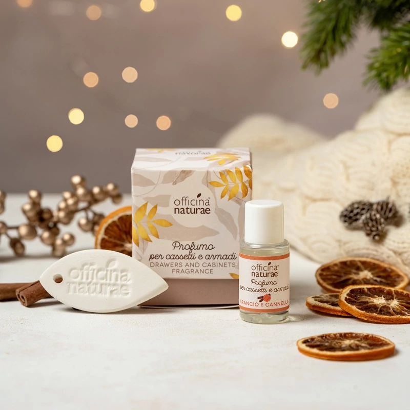 Il regalo natalizio perfetto: lo Scrigno Regalo Profumo per Cassetti e Armadi Officina Naturae. Profuma la tua biancheria e il tuo armadio con le magiche fragranze del Natale, grazie all’aroma di Cannella e agli oli essenziali biologici di scorza d’Arancio e Limone. Include una foglia in ceramica fatta a mano per un’esperienza olfattiva unica.