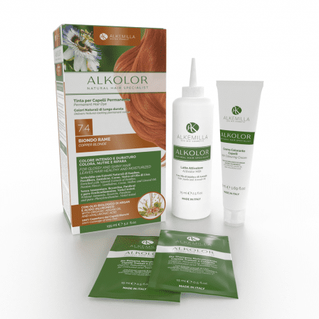 Alkolor, è una linea di tinte capelli permanenti senza Ammoniaca, Resorcina, Parabeni e Para-Fenilendiammina, Testate al Nichel, certificate Qualità Vegana e non testate sugli animali. Olio Biologico di Argan ed Olio di Lino,saggiamente miscelati ad estratti vegetali protettivi, idratanti e remineralizzanti come Bamboo, Passiflora,Zantalene, Cacao e Malva per una colorazione intensa e ricca di Riflessi. Copre alla perfezione i capelli bianchi, lasciando la chioma nutrita, idratata e lucente grazie anche all’acido Ialuronico dall’elevato potere antiossidante. La confezione contiene: 1 Tubo Crema Colorante Capelli Alkolor 50 ml 1 Flacone Latte Attivatore Alkolor 75 ml 1 Bustina Bio shampoo Ristrutturante Capelli Trattati e Colorati 15 ml 1 Bustina Bio Balsamo Ristrutturante Capelli Trattati e Colorati 1 Foglietto di Istruzioni 1 Paio di Guanti Monouso Crema Colorante 7.4 Biondo Rame Ingredients:aqua (water), ethanolamine, cetearyl alcohol, propanediol, laureth-3, ricinus communis(castor) seed oil, cetoleth-5, betaine, cocamidopropyl betaine, polysorbate 80, sorbitan stearate, oleyl alcohol, glycol distearate, stearic acid, palmitic acid, argania spinosa kernel oil*, glycerin, bambusa arundinacea stem extract, passiflora edulis fruit extract (passiflora edulis fruit juice), linum usitatissimum (linseed) seed oil, zanthoxylum bungeanumfruit extract, theobroma cacao (cocoa)seed extract, helianthus annuus seed oil, malva sylvestris (mallow) flower/leaf extract, hyaluronic acid, leuconostoc/radish root ferment filtrate, acrylates/ceteth-20 itaconate copolymer, pentasodium pentetate, copernicia cerifera (carnauba) wax, ceteareth-20, hydrogenated castor oil, tetrasodium edta, sodium hydrosulfite, sodium sulfite, ascorbic acid, sodium lauryl sulfate, potassium sorbate, sodium dehydroacetate, tocopherol, benzyl alcohol, sodium benzoate, toluene-2,5-diamine sulfate, 4-amino-2-hydroxytoluene, p-aminophenol, 4-chlororesorcinol, limonene, mentha viridis (spearmint) leaf oil. * Da Agricoltura Biologica Latte Attivatore con olio di Jojoba ed Olio di Avocado Ingredients: Aqua (Water), Hydrogen Peroxide, Cetearyl Alcohol, Ceteareth-30, Stearamidopropyl Dimethylamine, Simmondsia Chinensis Seed Oil (Simmondsia Chinensis (Jojoba) Seed Oil), Behentrimonium chloride, Lauryl Alcohol, Persea Gratissima Oil (Persea Gratissima (Avocado) Oil), Etidronic Acid, Myristyl Alcohol, Limonene, Isopropyl Alcohol, Parfum (Fragrance), Benzyl Benzoate, Oxyquinoline Sulfate, Tetrasodium EDTA, Simethicone, Ceteareth-20, Laureth-3 Bio shampoo Ristrutturante Capelli Trattati e Colorati Ingredients:Aqua [Water] (Eau), Sodium cocoyl sarcosinate, Cocamidopropyl hydroxysultaine, Ammonium lauryl sulfate, Linum usitatissimum (Linseed) seed extract (*), Prunus amygdalus dulcis (Sweet almond) fruit extract (*), Citrus limon (Lemon) fruit extract, Mangifera indica (Mango) fruit extract, Passiflora edulis fruit extract, Chamomilla recutita (Matricaria) flower extract (*), Urtica dioica (Nettle) leaf extract (*), Althaea officinalis root extract (*), Soy amino acids, Wheat amino acids, Arginine HCl, Serine, Threonine, Tocopherol, Behenamidopropyl dimethylamine, Lactic acid, Benzyl alcohol, Parfum [Fragrance], Glycerin, Benzoic acid, Dehydroacetic acid, Sodium benzoate, Linalool, Limonene, Hexyl cinnamal, Citronellol, Glycolic acid. Bio Balsamo Ristrutturante Capelli Trattati e Colorati Ingredients:Aqua [Water] (Eau), Cetyl alcohol, Stearyl alcohol, Linum usitatissimum (Linseed) seed extract (*), Prunus amygdalus dulcis (Sweet almond) fruit extract (*), Citrus limon (Lemon) fruit extract, Mangifera indica (Mango) fruit extract, Passiflora edulis fruit extract, Chamomilla recutita (Matricaria) flower extract (*), Urtica dioica (Nettle) leaf extract (*), Althaea officinalis root extract (*), Soy amino acids, Wheat amino acids, Arginine HCl, Serine, Threonine, Glycerin, Dipalmitoylethyl hydroxyethylmonium methosulfate, Behenamidopropyl dimethylamine, Benzyl alcohol, Parfum [Fragrance], Potassium sorbate, Sodium benzoate, Lactic acid, Linalool, Limonene, Hexyl cinnamal, Citronellol, Glycolic acid. * Da Agricoltura Biologica
