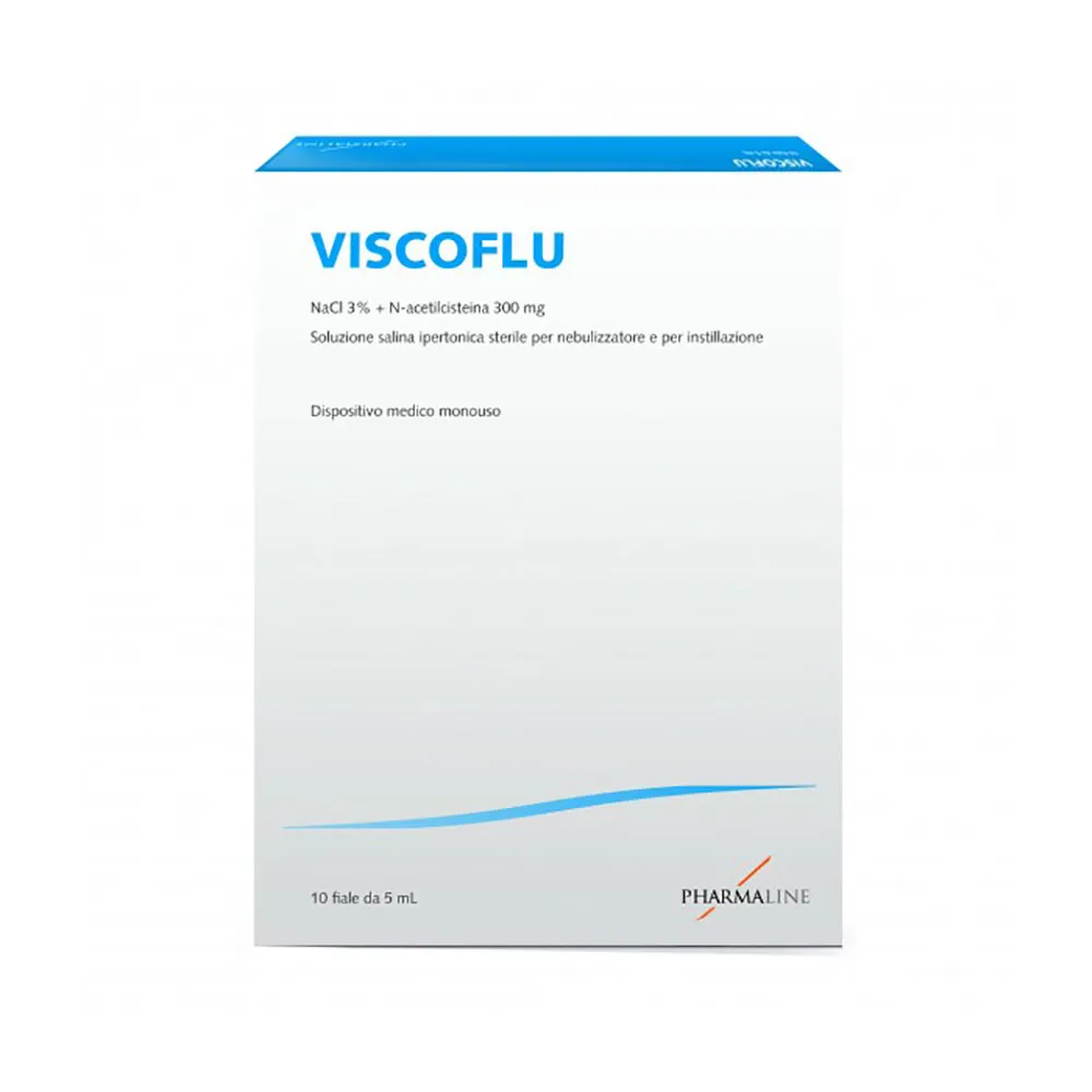 Pharma Line Viscoflu 10 Flaconi 5 ml è una soluzione salina ipertonica per nebulizzatore e per instillazione, Dispositivo medico monouso. Indicato nel trattamento delle affezioni delle vie respiratorie caratterizzate da ipersecrezione densa e vischiosa: bronchite acuta, bronchite cronica e sue riacutizzazioni, enfisema polmonare, mucoviscidosi, bronchiectasie, rinosinusite, otite mediosecretiva.