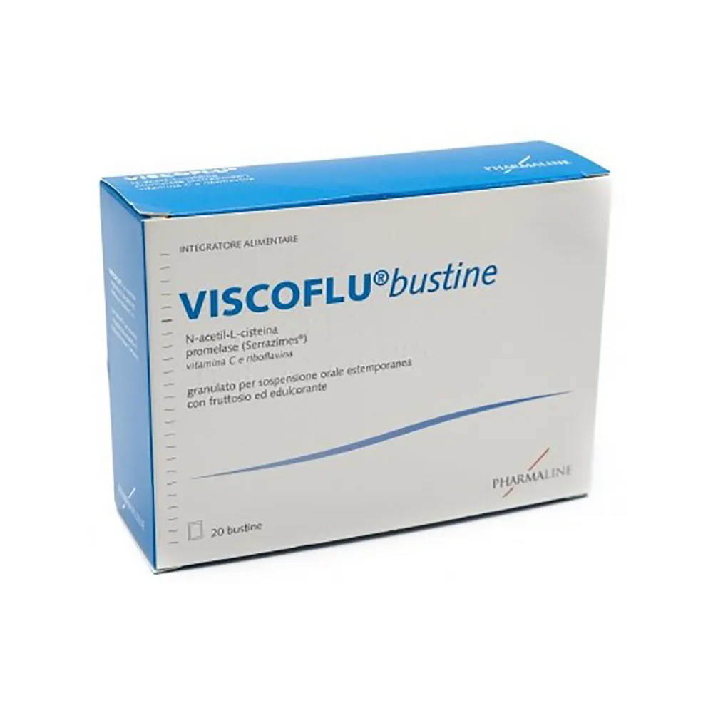 Viscoflu bustine contiene N-acetil-L-cisteina associata a promelase (Serrazimes, enzima proteolitico derivato dalla fermentazione controllata di maltodestrine tramite Aspergillus melleus), con vitamina C e riboflavina, utili per aiutare a proteggere le cellule dallo stress ossidativo e, rispettivamente, per contribuire all’efficienza del sistema immunitario e per favorire il buon funzionamento delle membrane mucose.
