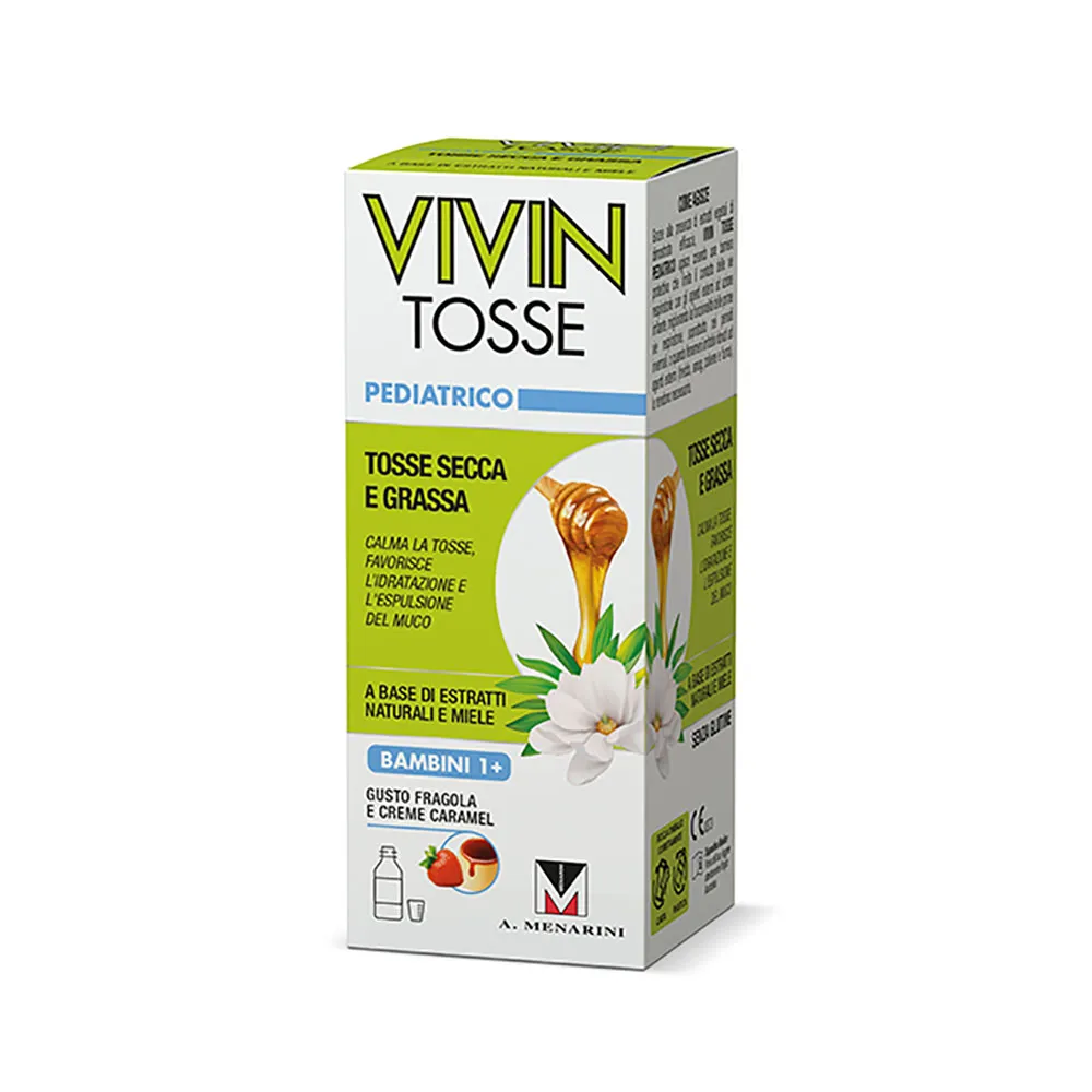 VIVIN TOSSE PEDIATRICO è un dispositivo medico a base di estratti naturali e miele, in grado di creare un film protettivo che calma la tosse proteggendo le prime vie aeree.