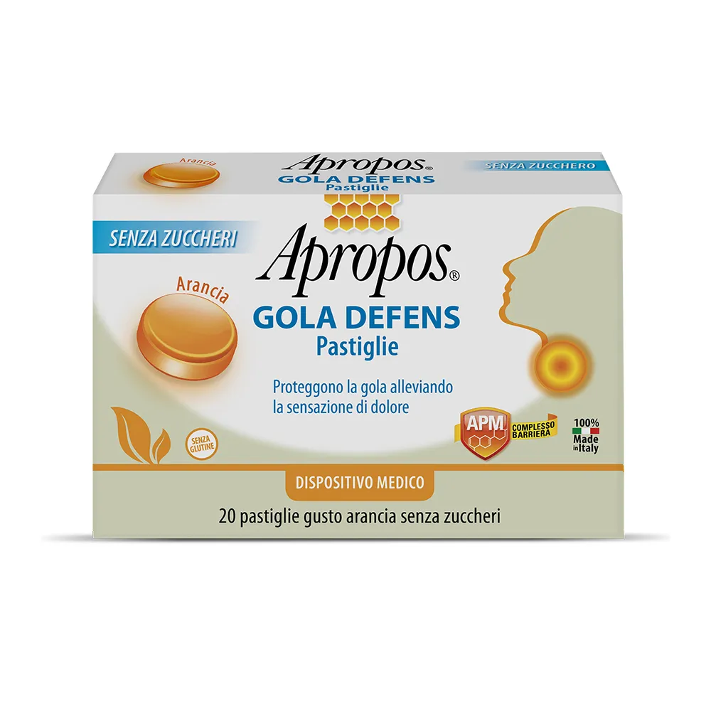 Apropos GOLA DEFENS Pastiglie, grazie al Complesso Barriera APM crea un film mucoadesivo ad effetto barriera che protegge la mucosa orofaringea dall’attacco di agenti esterni dannosi, idratandola. Grazie all’azione filmogena Apropos GOLA DEFENS Pastiglie mantiene la gola protetta dagli agenti esterni, alleviando la sensazione di dolore legata agli stati irritativi della gola, tipici delle faringiti e delle tonsilliti.