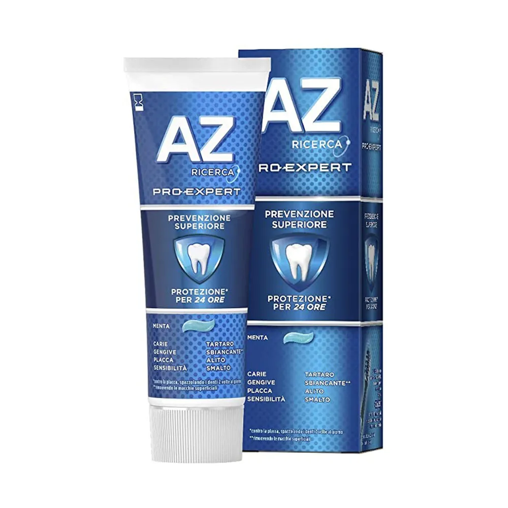 AZ Pro-Expert Prevenzione Superiore la nostra tecnologia di dentifrici più avanzata che aiuta a proteggere le 8 aree più controllate dai dentisti Una combinazione unica di ingredienti che offre protezione* per 24 ore *contro la placca, spazzolando i denti 2 volte al giorno. Fluoruro stannoso stabilizzato Carie – Sensibilità – Placca – Disturbi Gengivali – Alito Cattivo – Erosione dello Smalto – Tartaro – Macchie