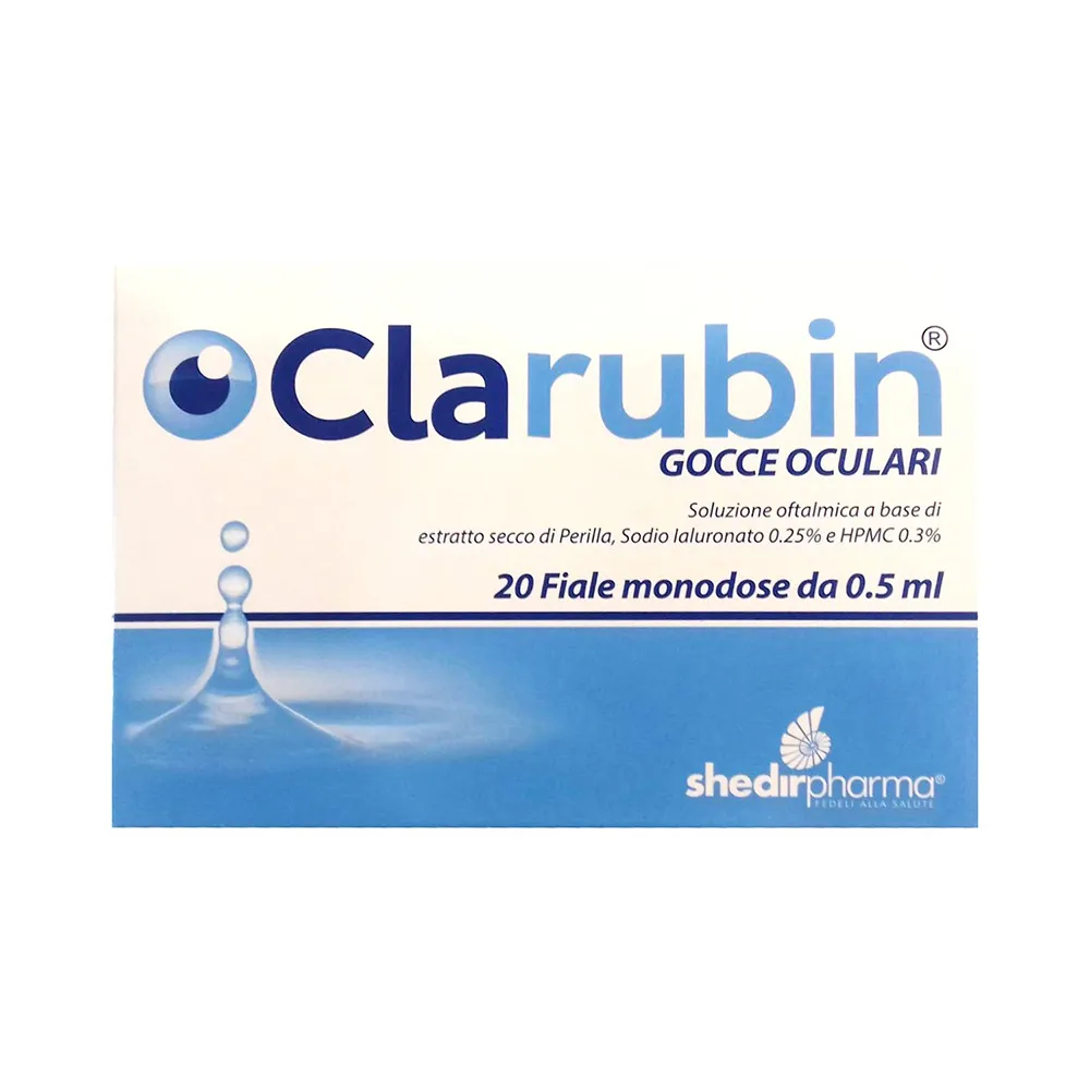 Clarubin Gocce Oculari Soluzione oftalmica a base di estratto secco di Perilla, Sodio Ialuronato 0,25% e HPMC 0,3%.