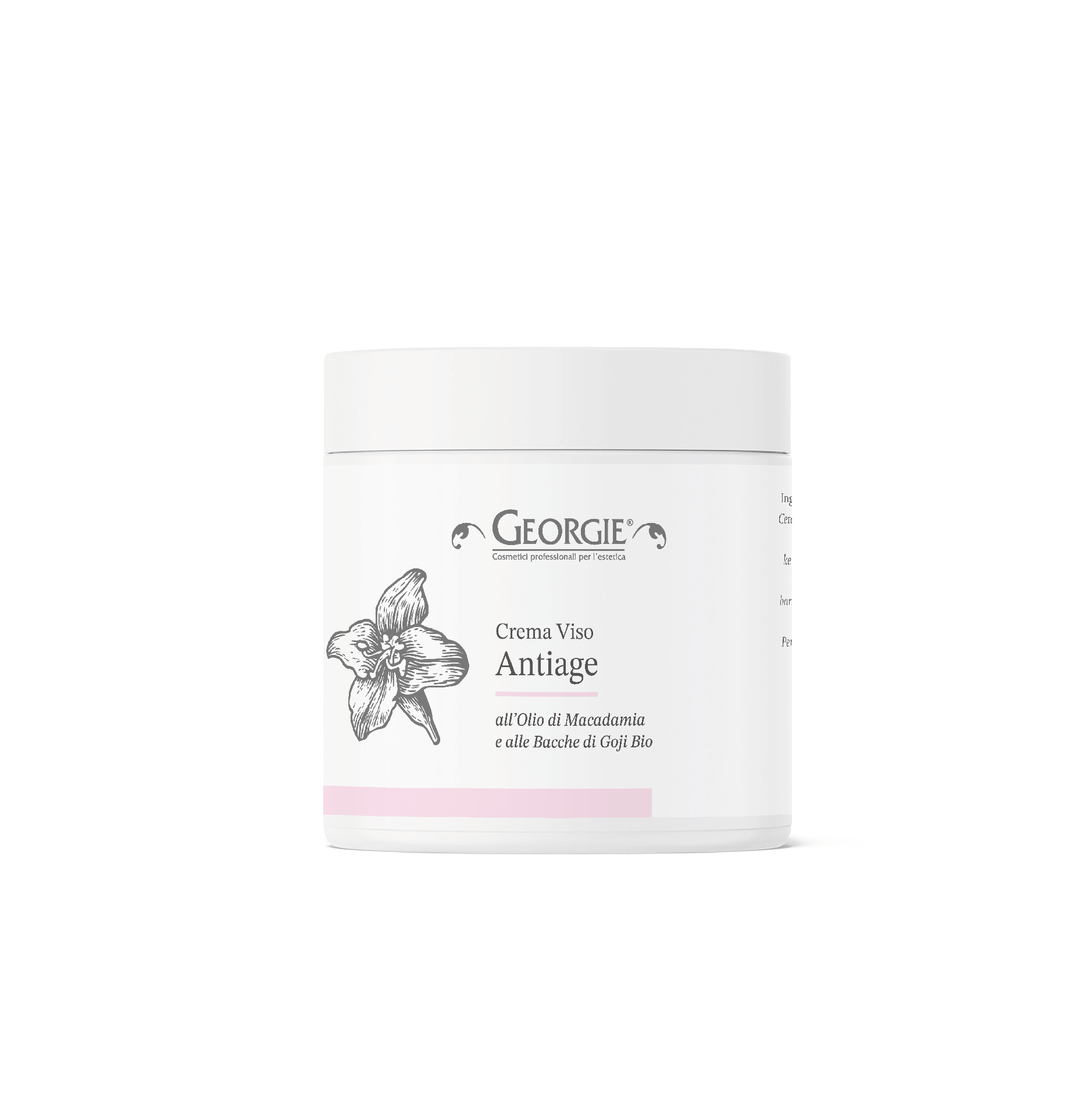 Crema Viso Antiage ad uso professionale con Olio di Macadamia ad azione nutriente e protettiva e Bacche di Goji Bio ad effetto antiossidante: per una pelle vellutata, elastica e luminosa.