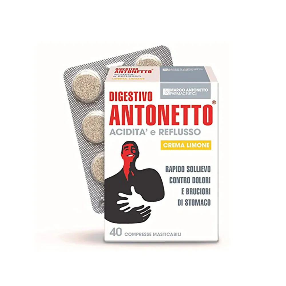 DIGESTIVO ANTONETTO ACIDITA’ E REFLUSSO è un dispositivo medico in forma di compresse masticabili, costituito dall’associazione di tre componenti: il carbonato di calcio, l’idrossido di magnesio e il simeticone. Esplicando un’azione protettiva e lenitiva della mucosa gastrica, agisce rapidamente contro i bruciori e i dolori di stomaco e il reflusso acido gastroesofageo.