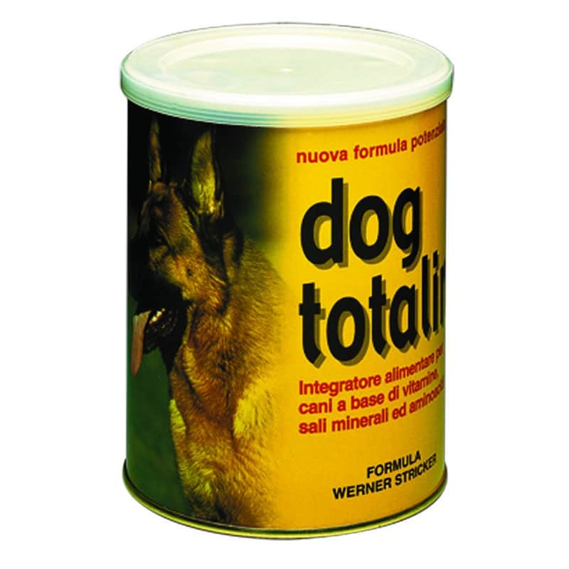 Dog Totalin è disponibile in barattolo da 450 g. Conservare a temperatura inferiore ai 26°C.