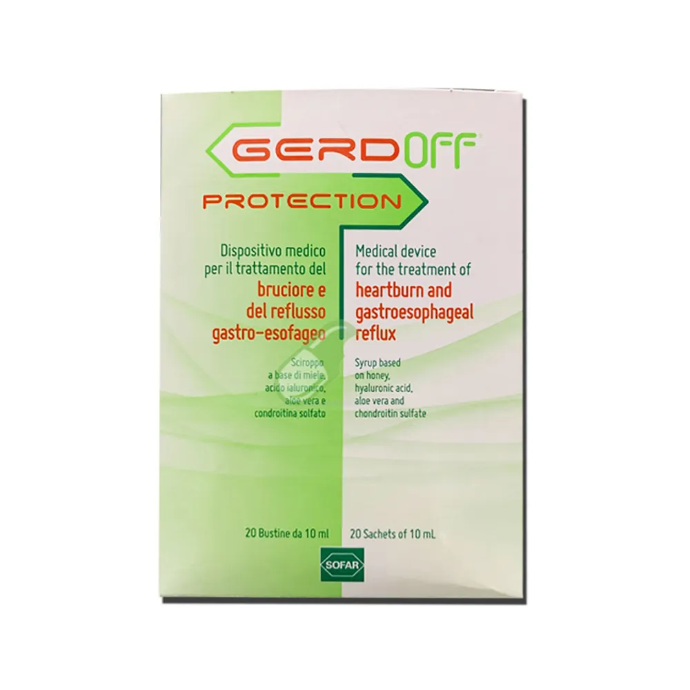 Gerdoff Protection Sciroppo un dispositivo medico a base di Miele, Acido Ialuronico, Aloe Vera e Condroitina Solfato.