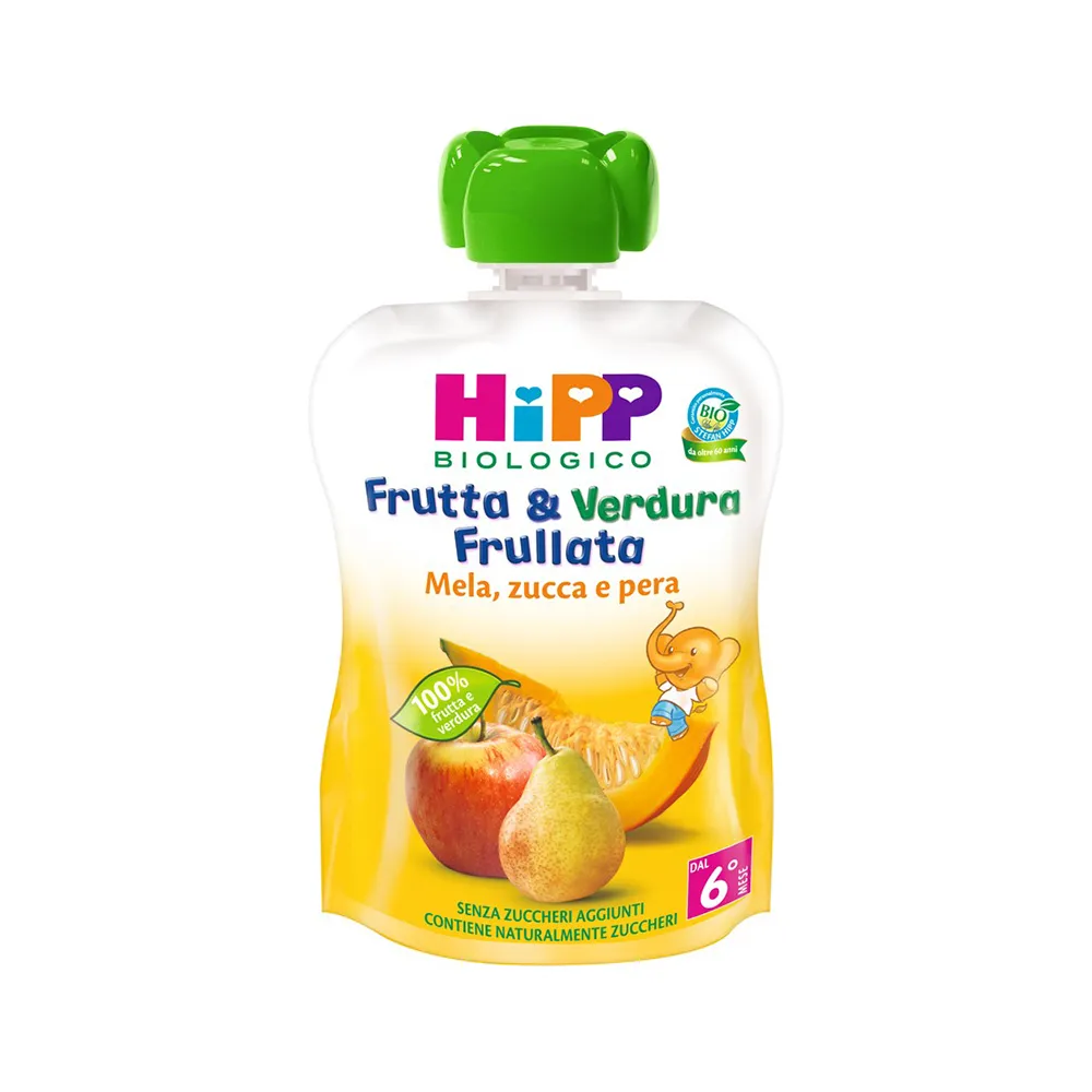 Hipp Frutta & Verdura Frullata Mela Pera e Zucca è un alimento per la prima infanzia adatto dal 6° mese. Ideale come merenda.