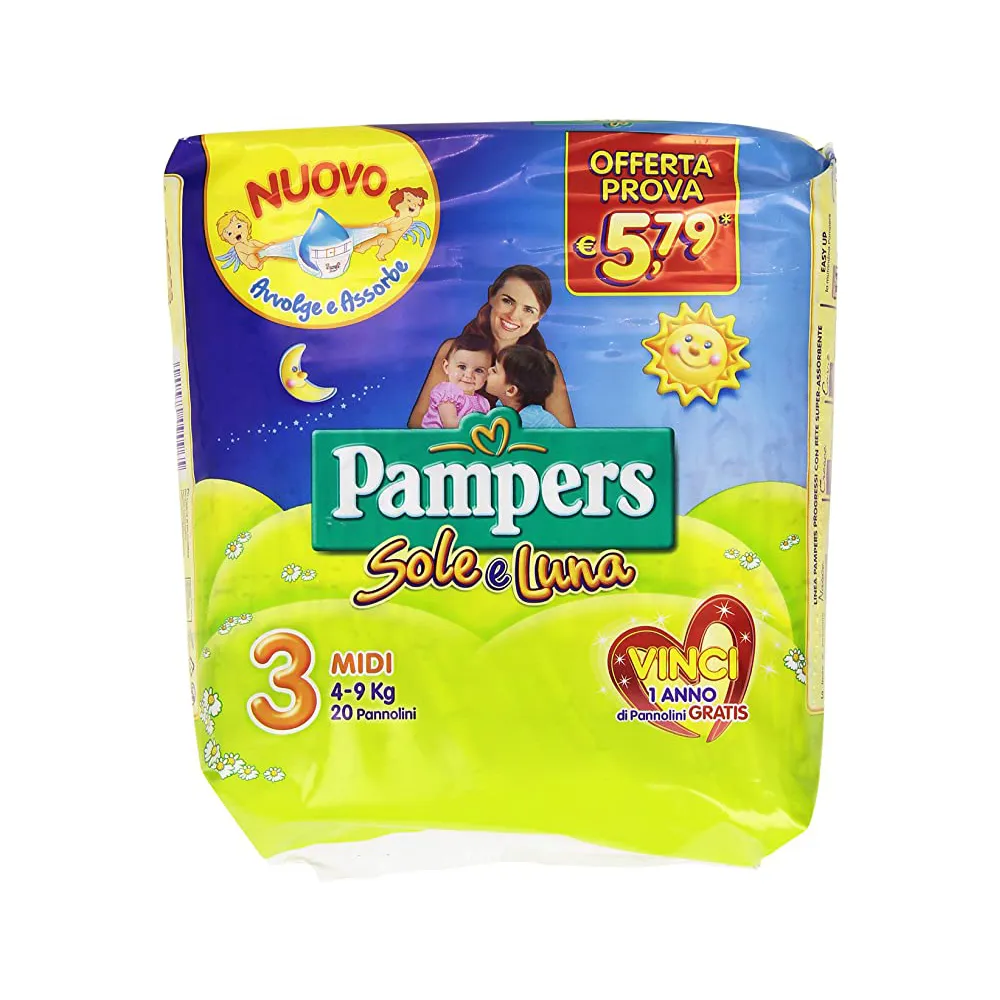 I pannolini midi Pampers Sole e Luna proteggono la pelle del tuo bambino con un tocco soffice e delicato.