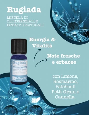 Energia e vitalità Le note erbacee sono le protagoniste indiscusse di Rugiada, un freschissimo mix di oli essenziali ed estratti naturali dal potere energizzante e rivitalizzante. Le note di testa agrumate profumano di limone e Petit Grain mentre il cuore pulsa di rosmarino e nel fondo danzano armoniosamente cannella e Patchouli, dando vita ad un profumo originale e ben bilanciato. Una miscela perfetta per chi vuole rinfrescare i sensi proprio come rugiada sull’erba e per chi desidera nuova energia da infondere alle proprie giornate. Ingredients: Parfum da estratti naturali