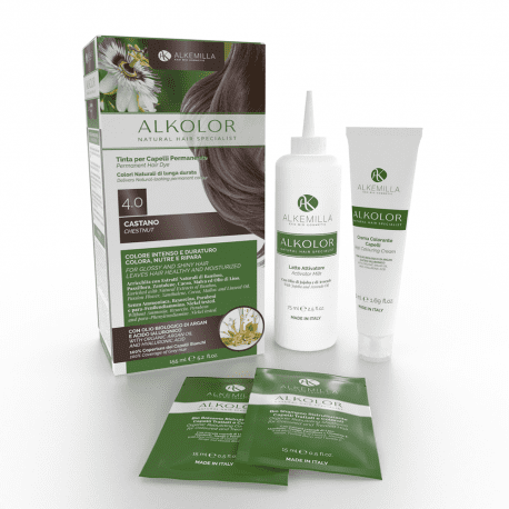 Alkolor, è una linea di tinte capelli permanenti senza Ammoniaca, Resorcina, Parabeni e Para-Fenilendiammina, Testate al Nichel, certificate Qualità Vegana e non testate sugli animali. Olio Biologico di Argan ed Olio di Lino,saggiamente miscelati ad estratti vegetali protettivi, idratanti e remineralizzanti come Bamboo, Passiflora,Zantalene, Cacao e Malva per una colorazione intensa e ricca di Riflessi. Copre alla perfezione i capelli bianchi, lasciando la chioma nutrita, idratata e lucente grazie anche all’acido Ialuronico dall’elevato potere antiossidante. La confezione contiene: 1 Tubo Crema Colorante Capelli Alkolor 50 ml 1 Flacone Latte Attivatore Alkolor 75 ml 1 Bustina Bio shampoo Ristrutturante Capelli Trattati e Colorati 15 ml 1 Bustina Bio Balsamo Ristrutturante Capelli Trattati e Colorati 1 Foglietto di Istruzioni 1 Paio di Guanti Monouso Crema colorante 4.0 Castano Ingredients: aqua (water), ethanolamine, cetearyl alcohol, toluene-2,5-diamine sulfate, propanediol, laureth-3, ricinus communis (castor) seed oil, cetoleth-5, betaine, cocamidopropyl betaine, polysorbate 80, sorbitan stearate, oleyl alcohol, glycol distearate, stearic acid, palmitic acid, argania spinosa kernel oil*, glycerin, bambusa arundinacea stem extract, passiflora edulis fruit extract (passiflora edulis fruit juice), linum usitatissimum (linseed) seed oil, zanthoxylum bungeanum fruit extract, theobroma cacao (cocoa)seed extract, helianthusannuus seed oil, malva sylvestris (mallow) flower/leaf extract, hyaluronic acid, leuconostoc/radish root ferment filtrate, acrylates/ceteth-20 itaconate copolymer, pentasodium pentetate , copernicia cerifera (carnauba) wax, ceteareth-20, hydrogenated castor oil, tetrasodium edta, sodium hydrosulfite, sodium sulfite, ascorbic acid, sodium lauryl sulfate, potassium sorbate, sodium dehydroacetate, tocopherol, benzyl alcohol, sodium benzoate, 2-methylresorcinol, 2,4-diaminophenoxyethanol hcl, m-aminophenol, 4- chlororesorcinol, limonene, mentha viridis (spearmint) leaf oil * Da Agricoltura Biologica Latte Attivatore con olio di Jojoba ed Olio di Avocado Ingredients: Aqua (Water), Hydrogen Peroxide, Cetearyl Alcohol, Ceteareth-30, Stearamidopropyl Dimethylamine, Simmondsia Chinensis Seed Oil (Simmondsia Chinensis (Jojoba) Seed Oil), Behentrimonium chloride, Lauryl Alcohol, Persea Gratissima Oil (Persea Gratissima (Avocado) Oil), Etidronic Acid, Myristyl Alcohol, Limonene, Isopropyl Alcohol, Parfum (Fragrance), Benzyl Benzoate, Oxyquinoline Sulfate, Tetrasodium EDTA, Simethicone, Ceteareth-20, Laureth-3 Bio shampoo Ristrutturante Capelli Trattati e Colorati Ingredients:Aqua [Water] (Eau), Sodium cocoyl sarcosinate, Cocamidopropyl hydroxysultaine, Ammonium lauryl sulfate, Linum usitatissimum (Linseed) seed extract (*), Prunus amygdalus dulcis (Sweet almond) fruit extract (*), Citrus limon (Lemon) fruit extract, Mangifera indica (Mango) fruit extract, Passiflora edulis fruit extract, Chamomilla recutita (Matricaria) flower extract (*), Urtica dioica (Nettle) leaf extract (*), Althaea officinalis root extract (*), Soy amino acids, Wheat amino acids, Arginine HCl, Serine, Threonine, Tocopherol, Behenamidopropyl dimethylamine, Lactic acid, Benzyl alcohol, Parfum [Fragrance], Glycerin, Benzoic acid, Dehydroacetic acid, Sodium benzoate, Linalool, Limonene, Hexyl cinnamal, Citronellol, Glycolic acid. Bio Balsamo Ristrutturante Capelli Trattati e Colorati Ingredients:Aqua [Water] (Eau), Cetyl alcohol, Stearyl alcohol, Linum usitatissimum (Linseed) seed extract (*), Prunus amygdalus dulcis (Sweet almond) fruit extract (*), Citrus limon (Lemon) fruit extract, Mangifera indica (Mango) fruit extract, Passiflora edulis fruit extract, Chamomilla recutita (Matricaria) flower extract (*), Urtica dioica (Nettle) leaf extract (*), Althaea officinalis root extract (*), Soy amino acids, Wheat amino acids, Arginine HCl, Serine, Threonine, Glycerin, Dipalmitoylethyl hydroxyethylmonium methosulfate, Behenamidopropyl dimethylamine, Benzyl alcohol, Parfum [Fragrance], Potassium sorbate, Sodium benzoate, Lactic acid, Linalool, Limonene, Hexyl cinnamal, Citronellol, Glycolic acid. * Da Agricoltura Biologica