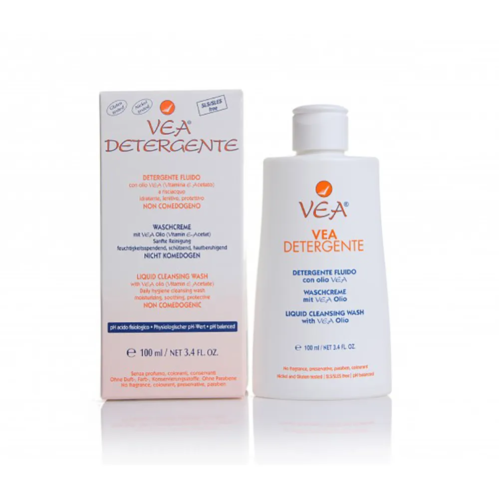 VEA DETERGENTE è un detergente di nuova concezione poiché contiene un solo tensioattivo (non ionico) di esclusiva origine vegetale, delicato e ad altissima tollerabilità, non irritante, associato all’olio VEA (vitamina E acetato allo stato puro) in percentuale elevata con effetto idratante, protettivo e lenitivo del prurito.
